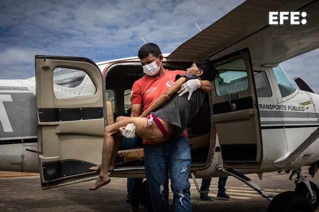Boa Vista (Brasil), 29/01/2023.- Una mujer yanomami con malaria grave y señales de desnutrición recibe asistencia al llegar en un avión en un aeropuerto en la ciudad de Boa Vista, en la capital de Roraima, (Brasil). El número de hospitalizaciones de niños yanomamis en estado grave aumentó en la última semana, desde que el Gobierno brasileño declaró una emergencia sanitaria en la mayor reserva indígena del país, y obligó a la única empresa aérea que presta el servicio de rescate a multiplicar sus vuelos. EFE/ Raphael Alves