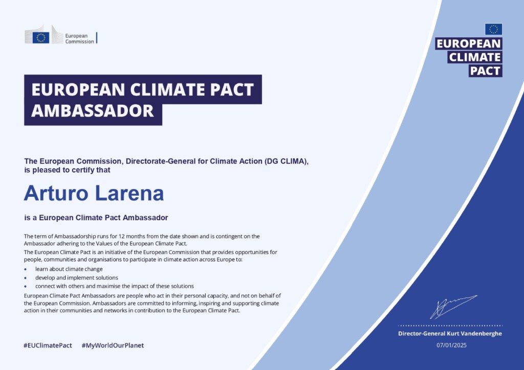 Los Embajadores de Pacto por el Clima de la UE están supeditados a la adhesión a los valores del Pacto Europeo por el Clima, pero no actúan en nombre de la Comisión Europea, ni reciben remuneración por ello.