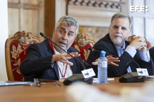 Santander, 15/07/2025.- El presidente de la Agencia EFE, Miguel Ángel Oliver (i), interviene en el curso «Retos de la democracia ante la desinformación», que organiza la Universidad Internacional Menéndez Pelayo con profesionales de los medios para crear un espacio de diálogo y aprendizaje. EFE/ Pedro Puente Hoyos
